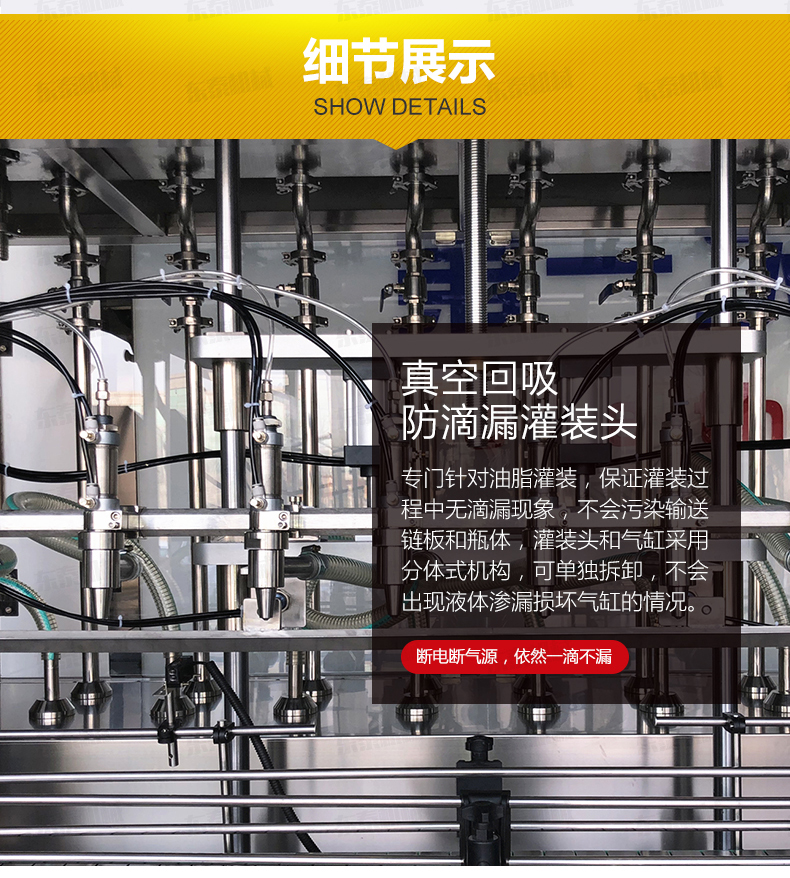 1、灌裝頭采用知識產權局認證的實用新型專利:真空回吸防滴漏灌裝頭